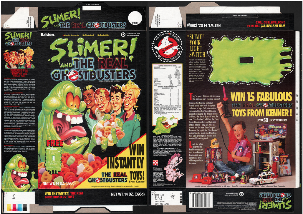 Whether you entered or actually won 15 Kenner The Real Ghostbusters toys because it could be related Ralston’s creative had a cardboard cutout “slime” light switch cover. Since even they put slime in quotation marks, the gimmick of glowing cardboard must have been so played yo.