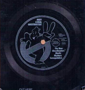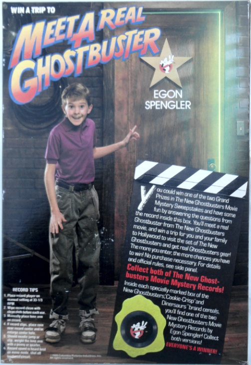Inside “specially-marked boxes” of ‘New Ghostbusters’ (oh so that’s what they called it) Cookie Crisp, and Dinosaurs brand cereals were one of two Movie Mystery Sweepstakes records. Their was (as pictured above) a white version and a second gold color record. After cutting (most likely with adult supervision) away the square part of the record, you’d play either record ready to answer trivia questions. Which were asked to you by Maurice LaMarche, whose many voices included Egon Spengler in The Real Ghostbusters.