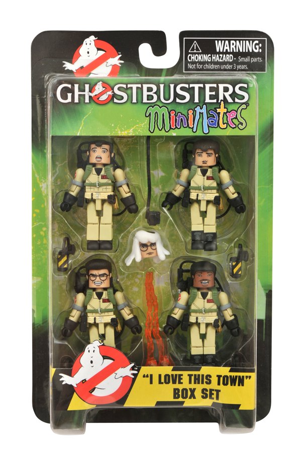 For Ghostbusters 30th Anniversary, Art Asylum, a Diamond Select Toys brand has created a new set of Ghostbusters Minimates. Called “I Love This Town,” this 4 pack box set is based somewhat on the temple/rooftop, Gozer battle scene. Features of this set include interchangeable parts, accessories, and removable Proton Packs.