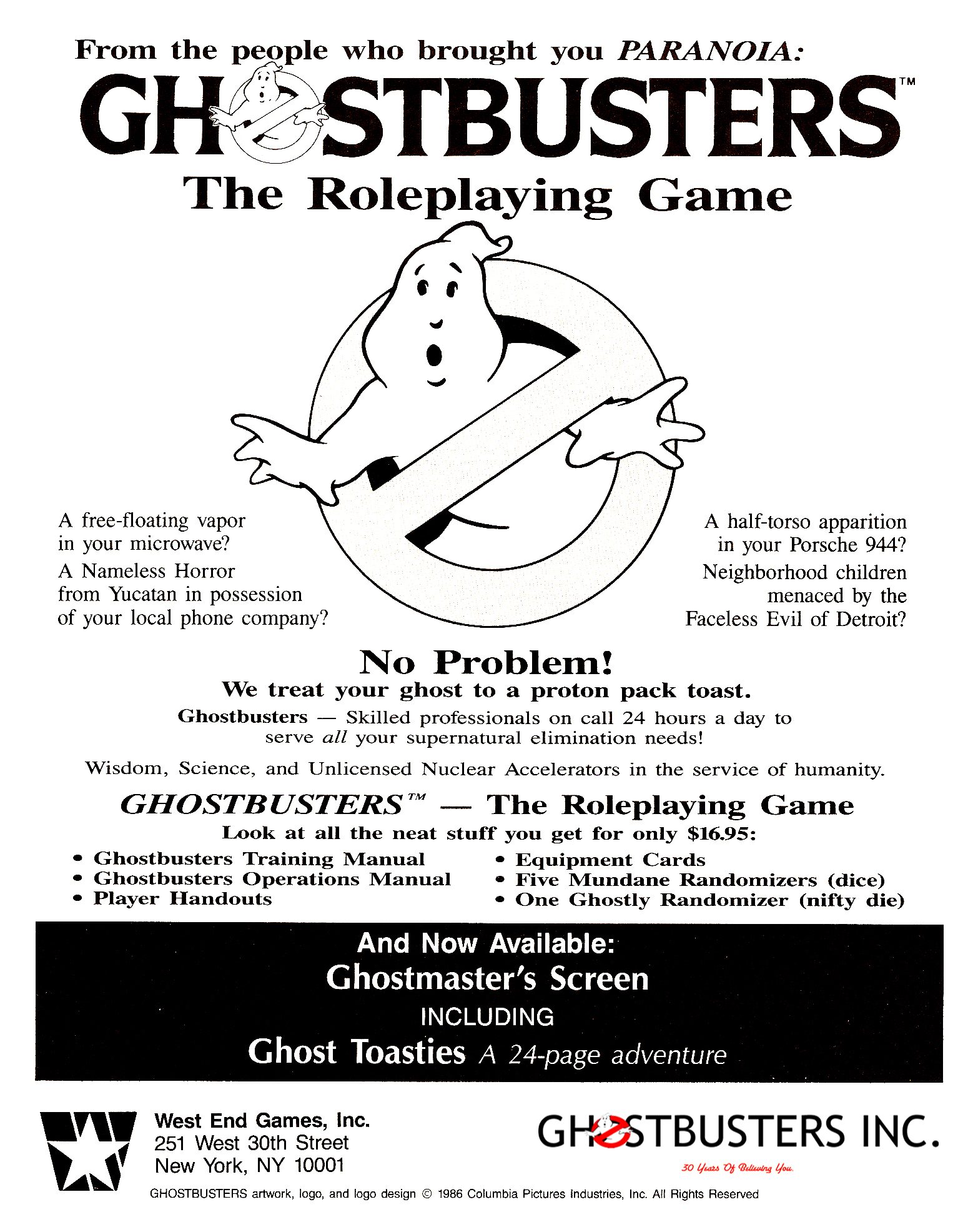 In 1986 West End Games published Ghostbusters™ A Frightfully Cheerful Roleplaying Game. One of the things this one of a kind Ghostbusters game book came with were ID cards for the Ghostbusters, Janine, and Dana. Sorry Louis.